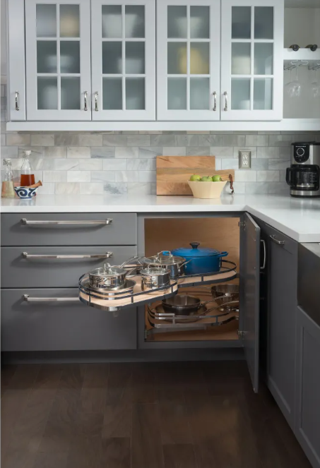 Turn blind corner cabinets into an easily accessible storage solution with a 15" Blind Corner Swingout in Polished Chrome Finish with Walnut Shelves. Unit includes two trays that have independent movement and two structure support posts. The height of the shelves is adjustable. Smooth pivot movement of shelves and metal railing ensures items stay secure in and out of the cabinet. Left-handed units are for openings that are on the left of the blind. Requires a 15" minimum opening for 1-1/2" face frame applications and 16-1/2" opening in frameless and cabinets with less than 1-1/2" face frame. Fits cabinet interior heights from 20" to 29-1/2". To view available specifications and installation instructions select all product options.